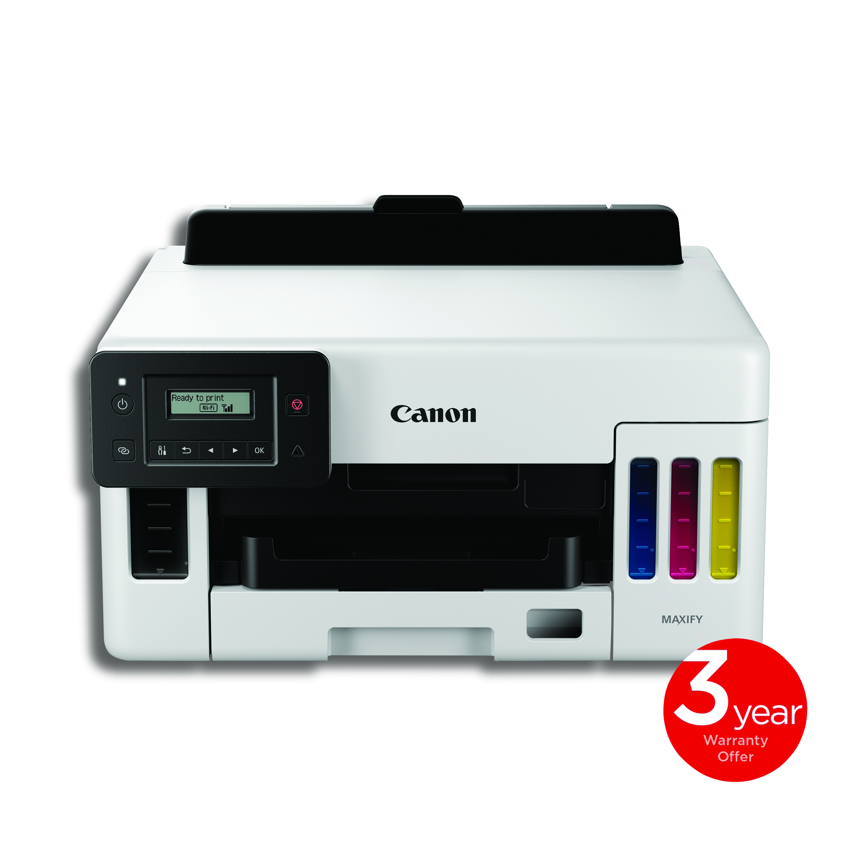 The Maxify GX5050 A4 inkjet colour printer is ideal for businesses which required a high volume printing. With functionality of Hi-Speed USB, Wi-Fi, Ethernet, Print and Cloud. This printer has refillable ink tanks (CYMK), up to 14,000 sheets printed in standard mode or up to 6,000 if printing in monochrome. For higher print yield switch to Economy mode for greater savings. Speeds of up to 24 ipm in black and 15.5 ipm in colour. With 2 paper cassettes providing up to 350 sheets (plain paper). Can print banners up to 1.2m length. Print resolution up to 600 x 1200 dpi. Controlled via an LCD 2-line screen.