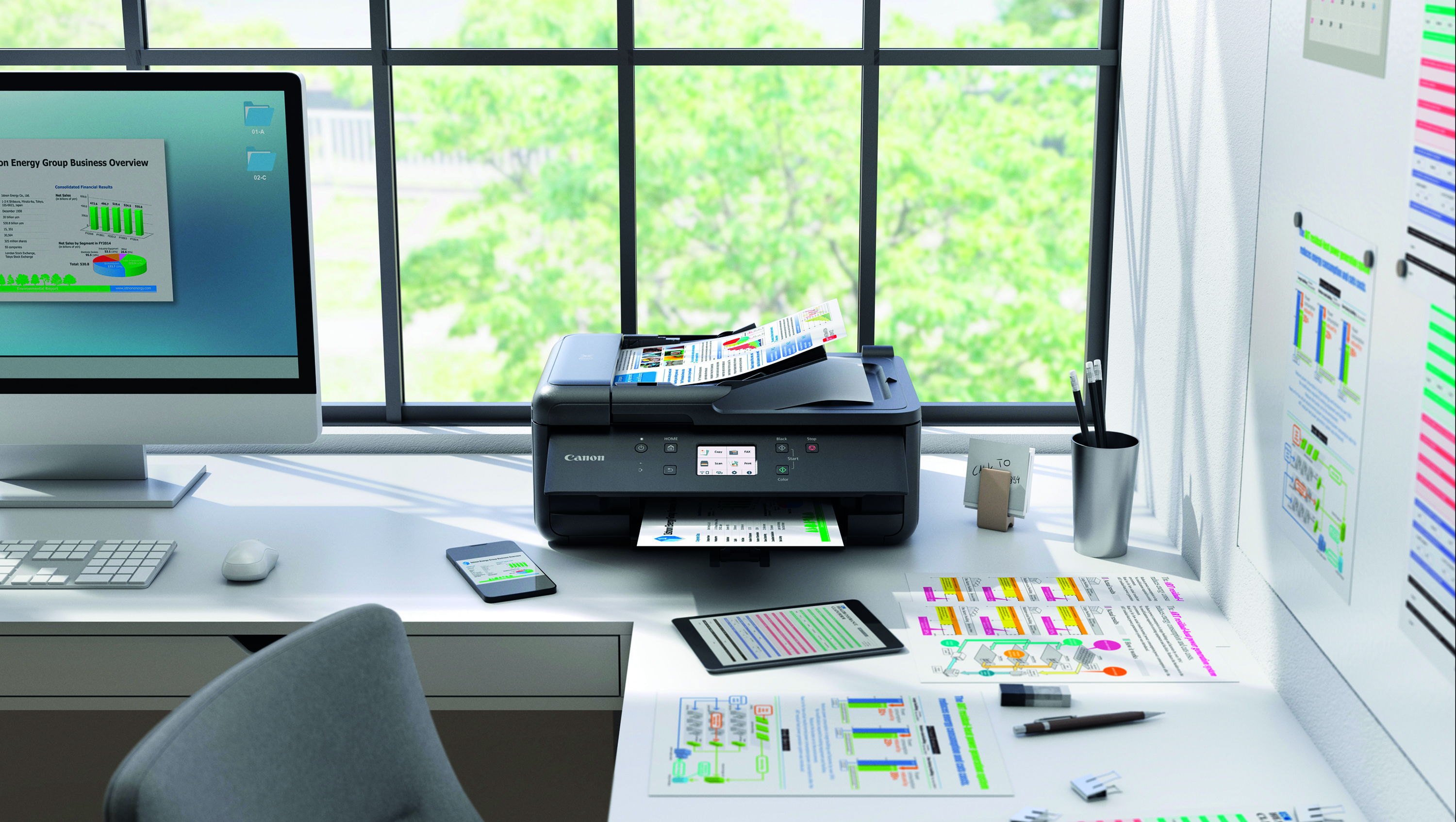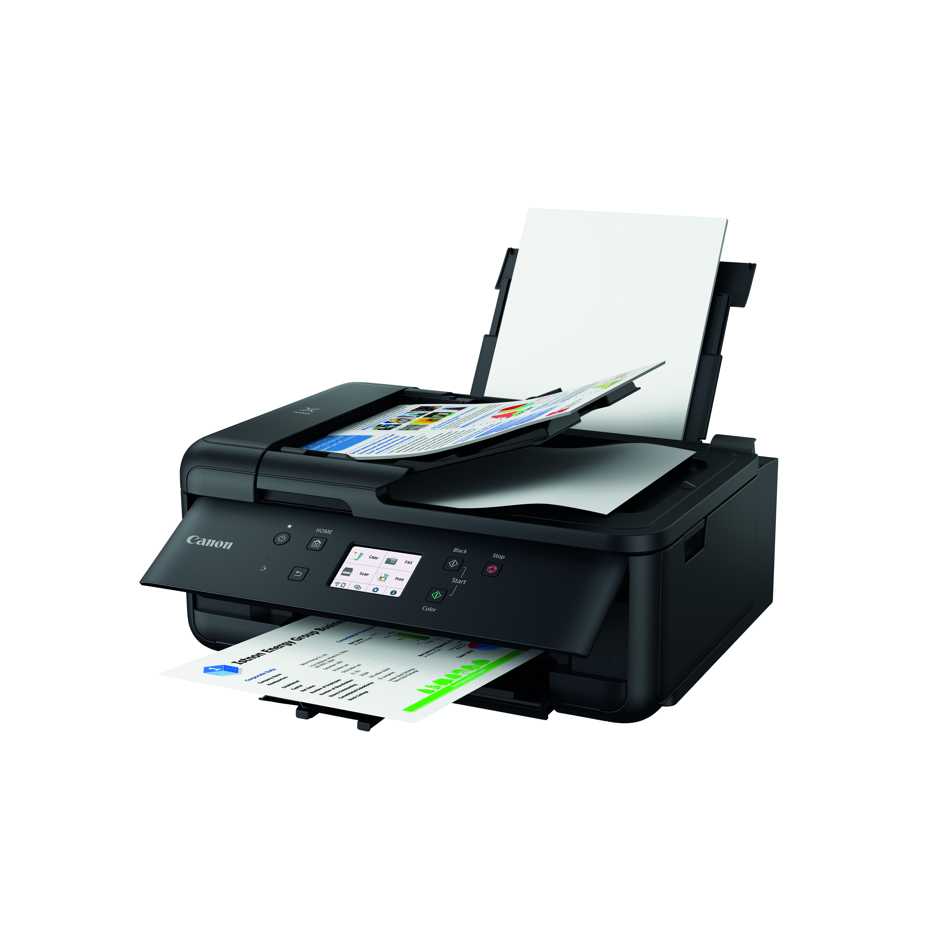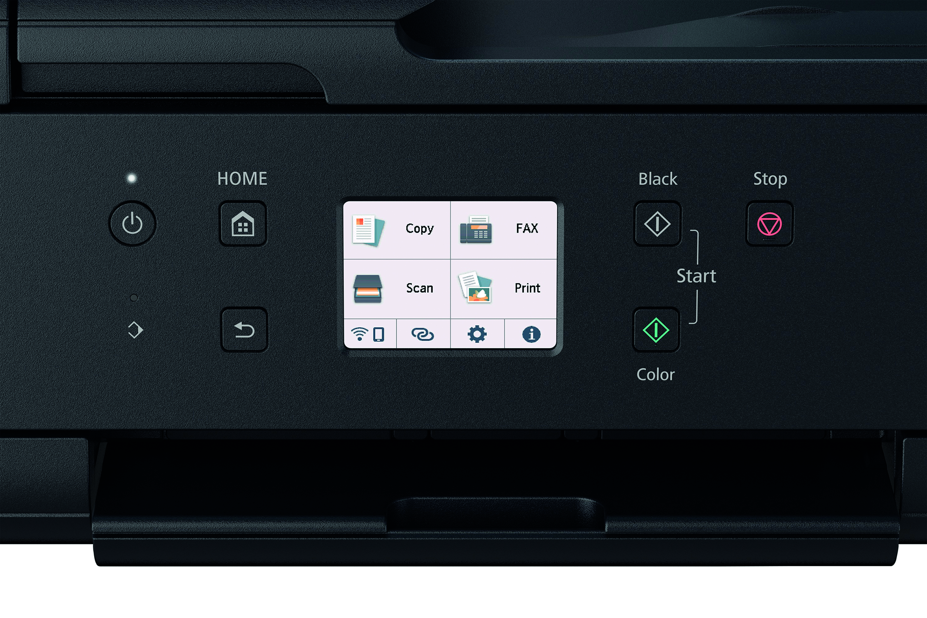 Compact 4-in-One home office printer with simple Wi-Fi and cloud connectivity for print, copy, scan and fax productivity. Print and scan straight from your smart devices (iOS and Android) with Canon Print app. Also compatible with Apple AirPrint and Mopria and Android. Fuss-free remote working with cloud printing and scanning direct from the printer or via the Canon Print app using Cloud Link - no PC required. Compatible with Dropbox, Evernote, Google Drive and more. Print vibrant, detailed borderless colour photos up to A4 and pin-sharp documents with the five single ink cartridge system. Automatic 2-sided printing. Easily copy, scan and fax multi-page documents with the 20-sheet ADF, can handle various media types and front and rear paper feeding. Supplied with set-up ink cartridges. With a 75mm LCD colour touch screen panel.