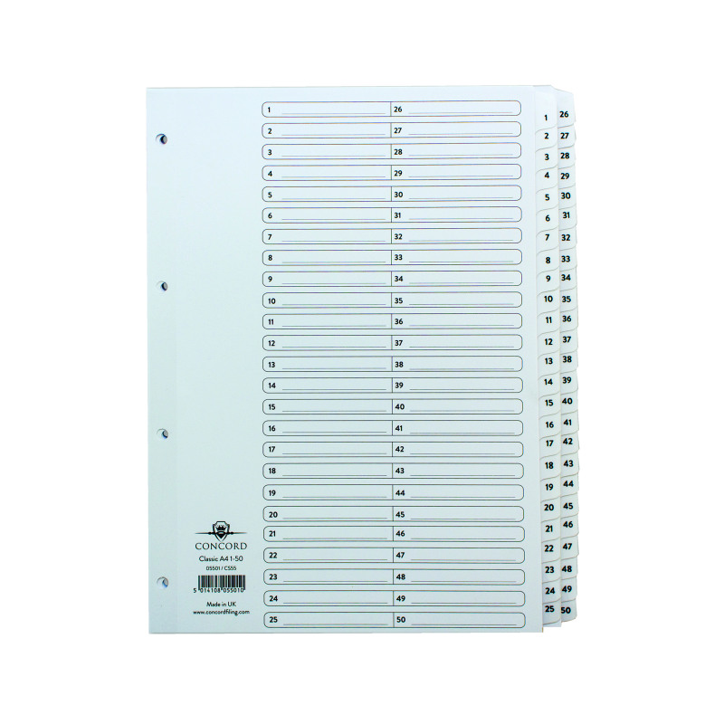 This Concord 1-50 Classic Index Divider is ideal for use in lever arch files and ring binders. Sized to A4 and hole punched, they offer you an easy way to archive and index your files and documents. With a pre-printed numerical indexing system and tabs numbered 1-50, it is easy to organise files for fast retrieval. Transparent Mylar reinforced tabs and punched holes help ensure long-lasting, tear-resistant durability.