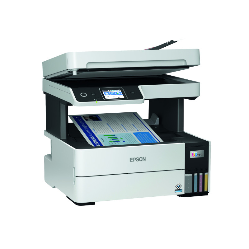 This Epson ET-5170 A4 Inkjet printer can print, scan, copy and fax ideal for home offices and small businesses. Refillable ink tanks using cost saving replacement ink bottles. Printing is fast with no warm-up time, the PrecisionCore technology offers improved reliability, less downtime and less environmental impact. Features include an automatic document feeder for up to 35 pages and duplex printing. All controlled via a 61mm colour touch panel.