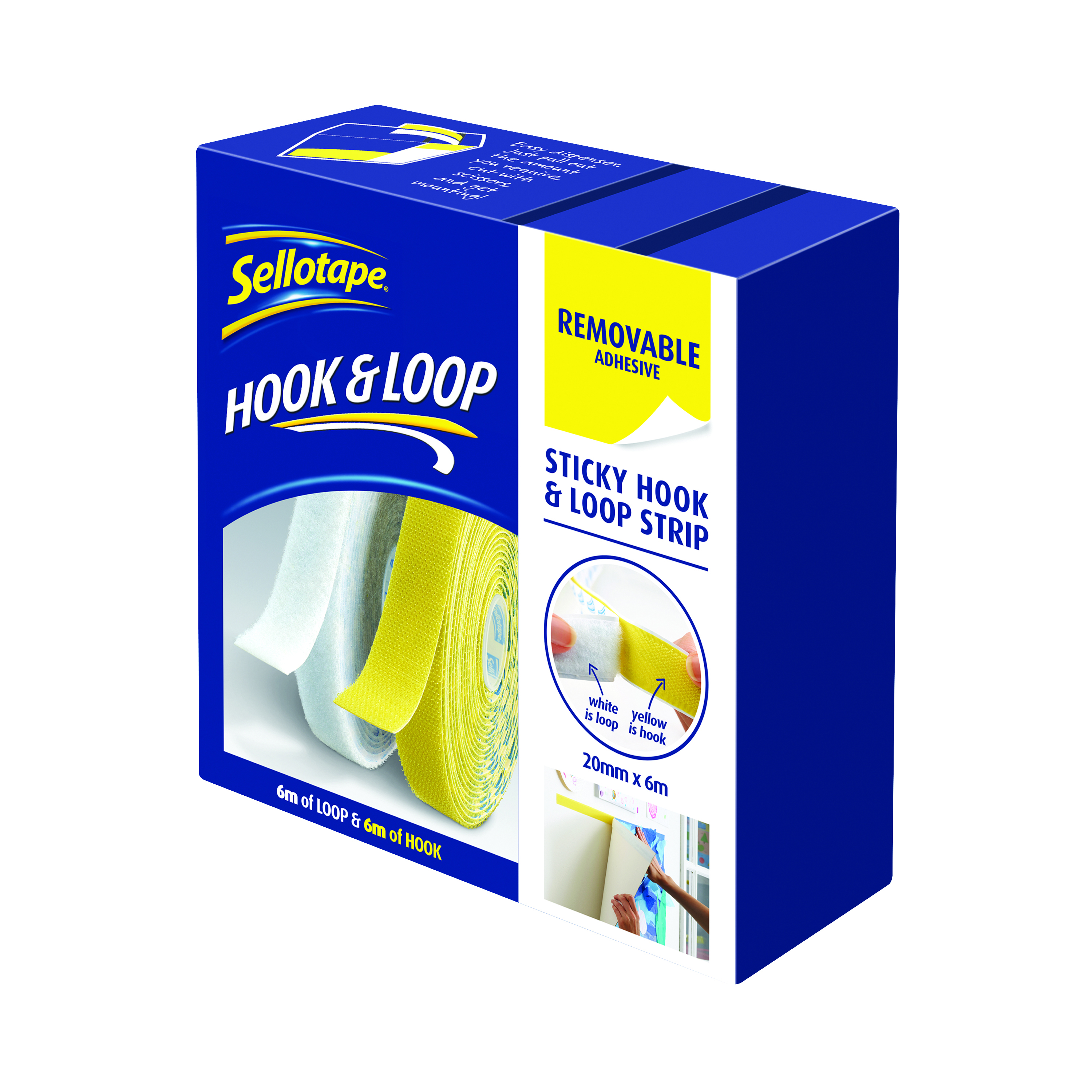 Quick and strong mounting solution for your workplace displays materials, signs, and posters. Sellotape Sticky Hook and Loop Removable Strips make affixing exhibitions and displays at the workplace simple and fast. 20mm x 6m repositionable hook and loop strips.