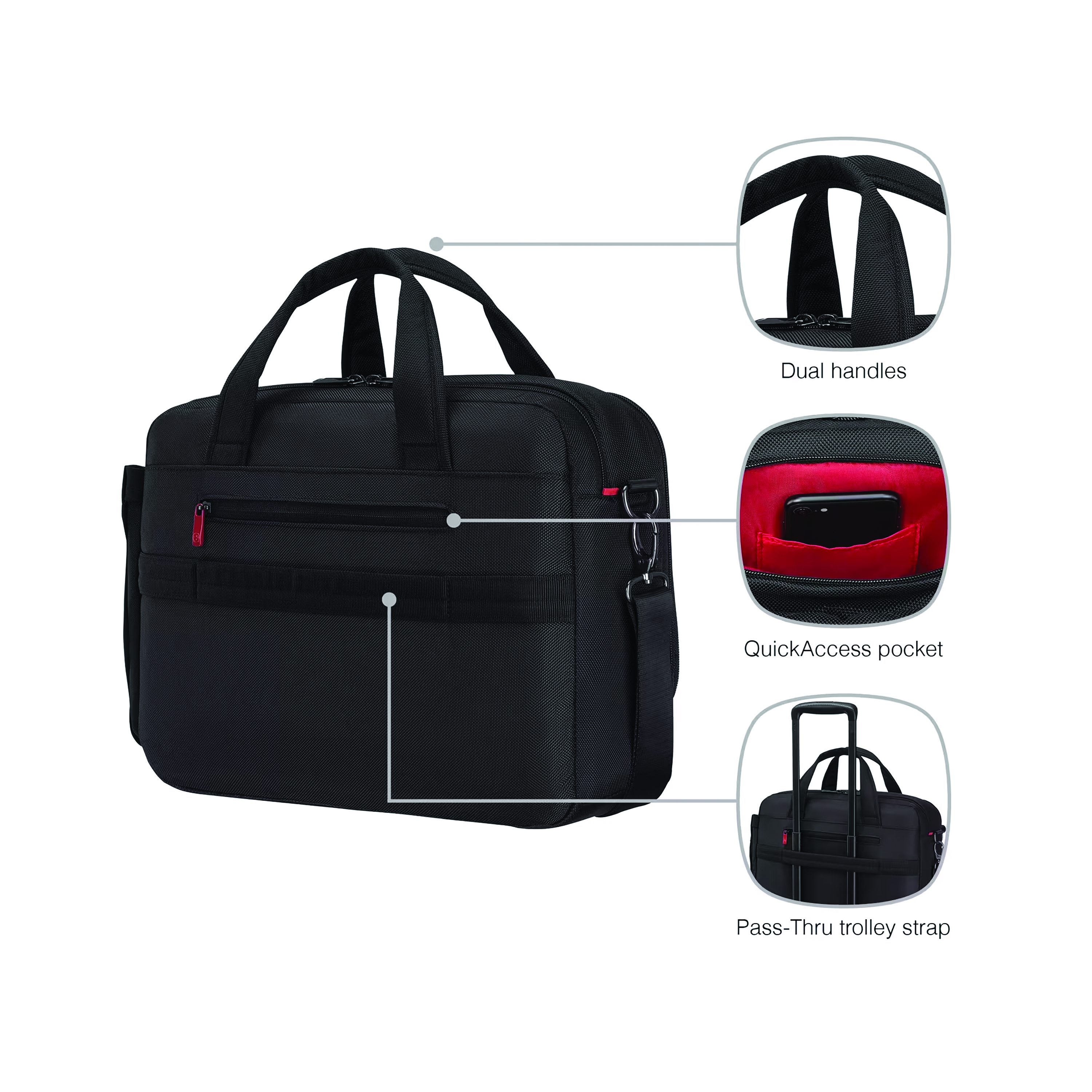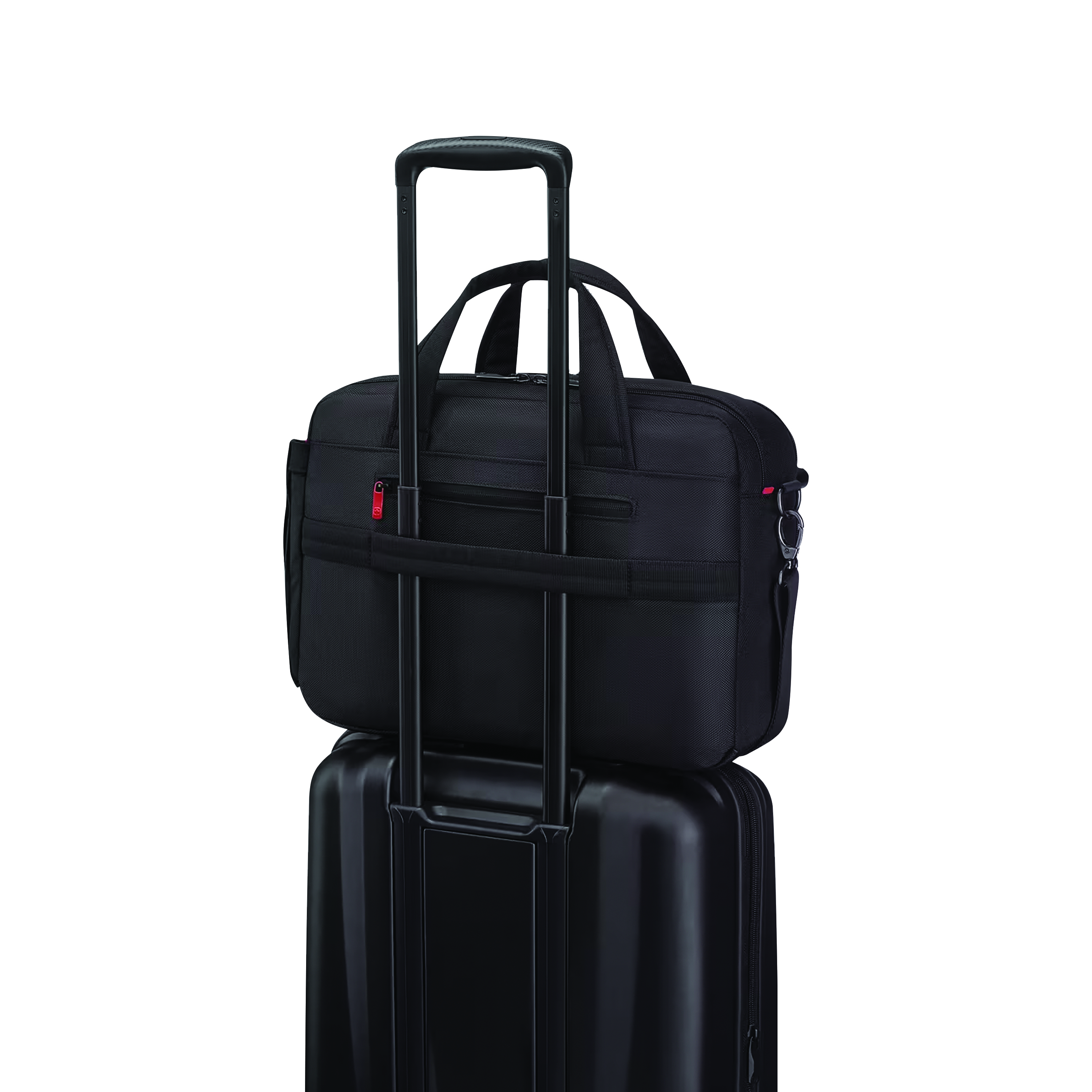 - Pass-Thru trolley strap slides over wheeled luggage handles for easy travel with multiple bags